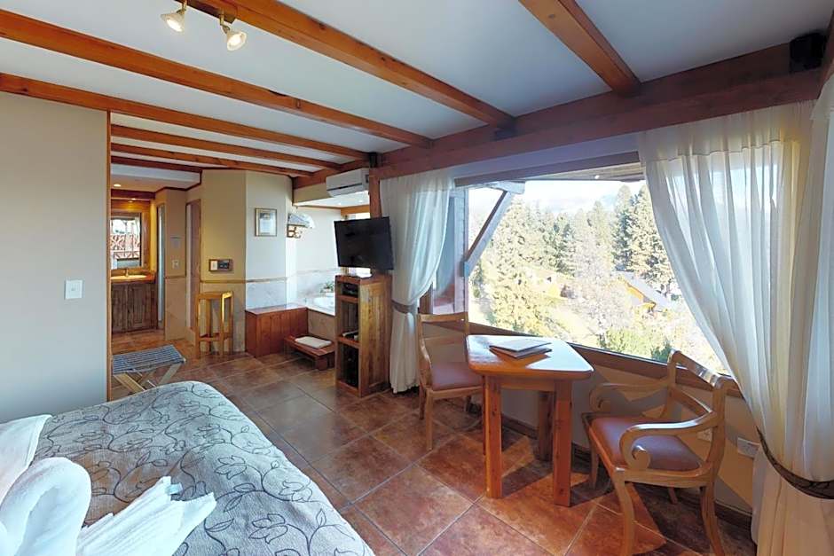 Ideally located on a bluff above Playa Bonita, this master suite offers splendid views of Nahuel Huapi Lake. The suite is equipped with a private bathroom with a double hot tub with air blower, a hydro-massage shower and heated towel racks. The room is fitted with a king-size bed with egyptian cotton sheets, a kitchenette, a 32” flat-screen TV with a rotating base and surround sound system, and a safety-deposit box.
